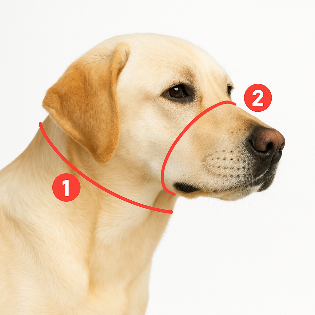 📏 Koot: useita vaihtoehtoja pienistä suuriin rotuihin, valinta kuononympärysmitan mukaan