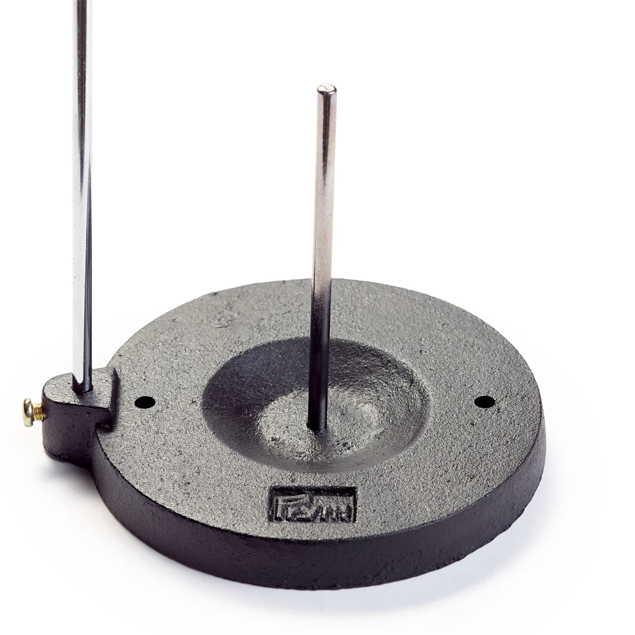 Tämä teline on sitä varten. Pohja on valmistettu valuraudasta ja tapit ruuvataan siihen kiinni. Valurautainen pohja tekee telineesta erittäin vakaan ja paikallaan pysyvän.
