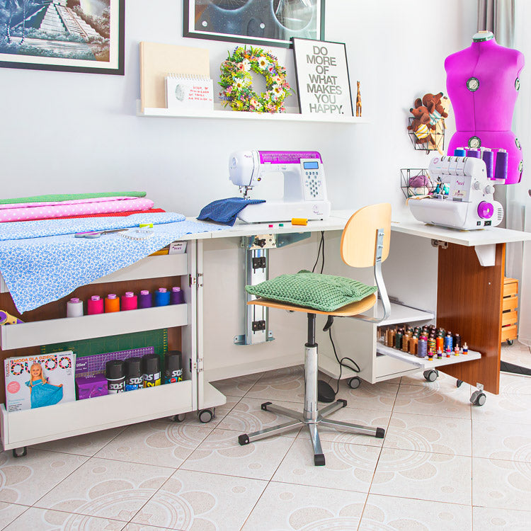 Tästä lähtien sinulla on kaikki ompelussa tarvitsemasi käsillä. Kun et käytä ompelukonettasi, voit piilottaa kaiken muutamalla liikkeellä kaapiin ja kotisi, työtilasi on siisti.