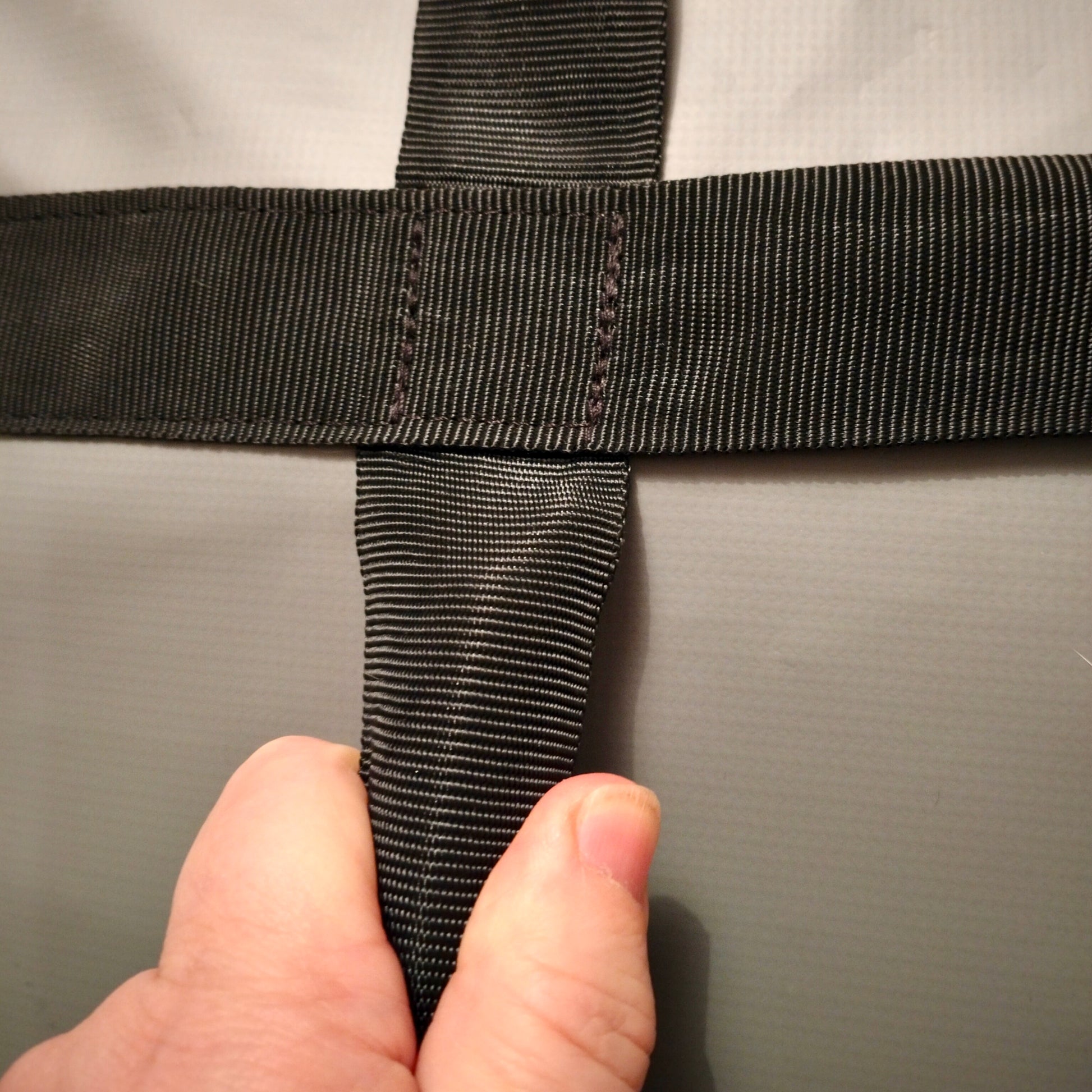 <3 Harmaapohjaisessa tuotteessa nauhasta on tehty tuotteeseen käsilenkit joiden sisään on laitettu muoviputki niin, että tuotteesta saadaan parempi tarttumaote käsilenkin osuudelta.